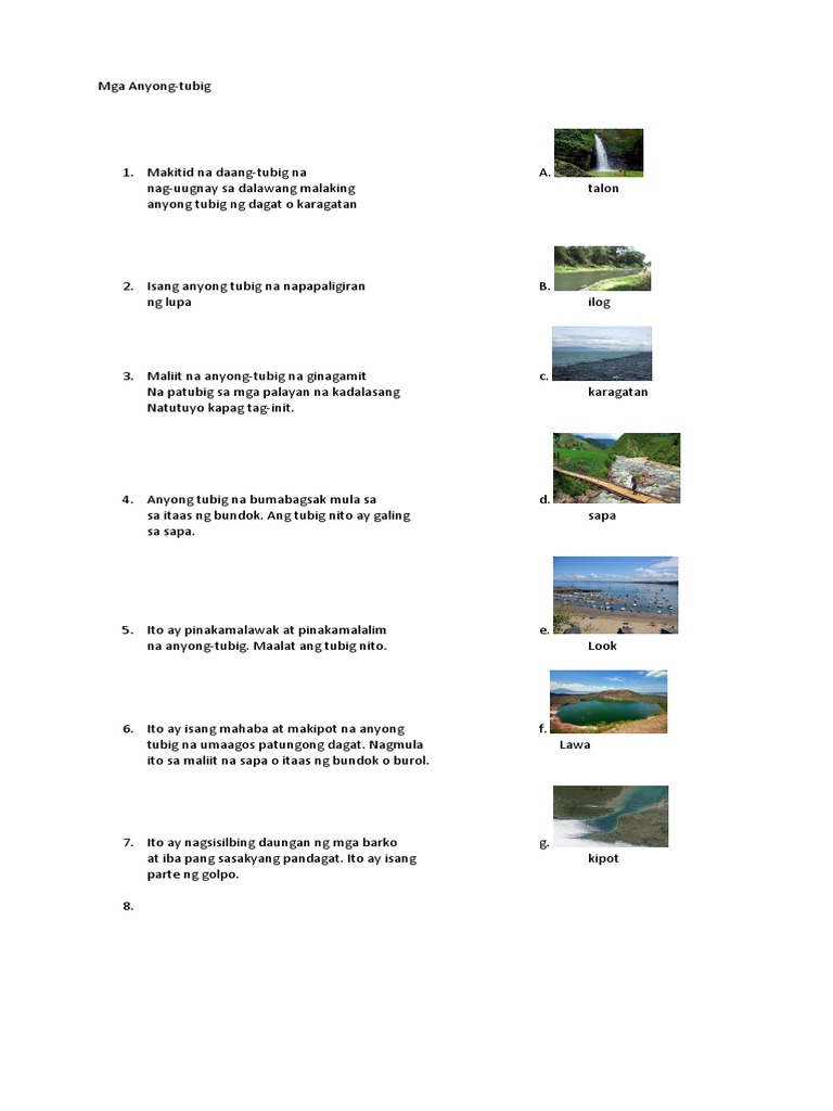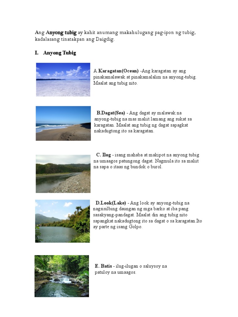 Here are the different types of bodies of water with their description and equivalent English terms. ANYONG TUBIG AT ANYONG LUPA DRAFT. ___5ito ay malawak na anyong tubig na mas maliit lamang ang sukat sa karagatan.