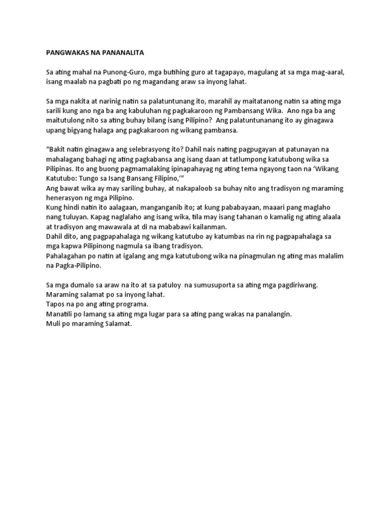 Marami tayong natutuhan at espirituwal tayong napasigla habang nakikinig tayo sa mga mensaheng inilahad at. 2021-05-15 View pangwakas na pananalitadocx from aa 1pangwakas na pananalita sa ating mahal na punong guro mga kapwa ko mga guro at sa lahat ng mga mag aaral ng institusyong ito. PANGWAKAS NA PANANALITA SA PAGDIRIWANG NG PWU ARAW NG WIKA AT KULTURA Showing 1-1 of 1 messages.