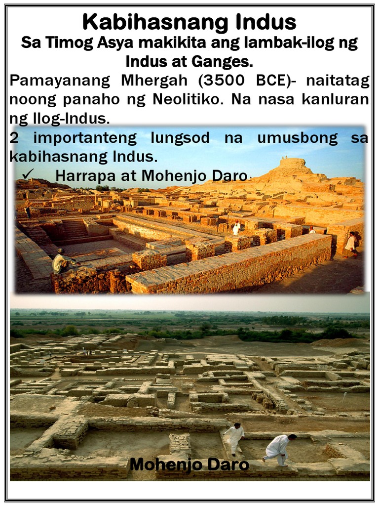 2013-01-28 Ang Sinaunang Kabihasnan sa Lambak ng Ilog Indus Matapos ang mahabang panahon ang mga kabihasnan sa lambak ng Tigris at Euphrates ay bumagsak. Ang lambak ilog Indus at Ganges ay makikita sa Timog Asya. Ang lupain ng Indus ay di hamak na mas malawak kaysa sa sinaunang Egypt at Mesopotamia Sakop nito ang malaking bahagi ng Hilagang Kanluran ng dating Indiaat ang lupain kung saan matatagpuan ang Pakistan sa kasalukuyan.