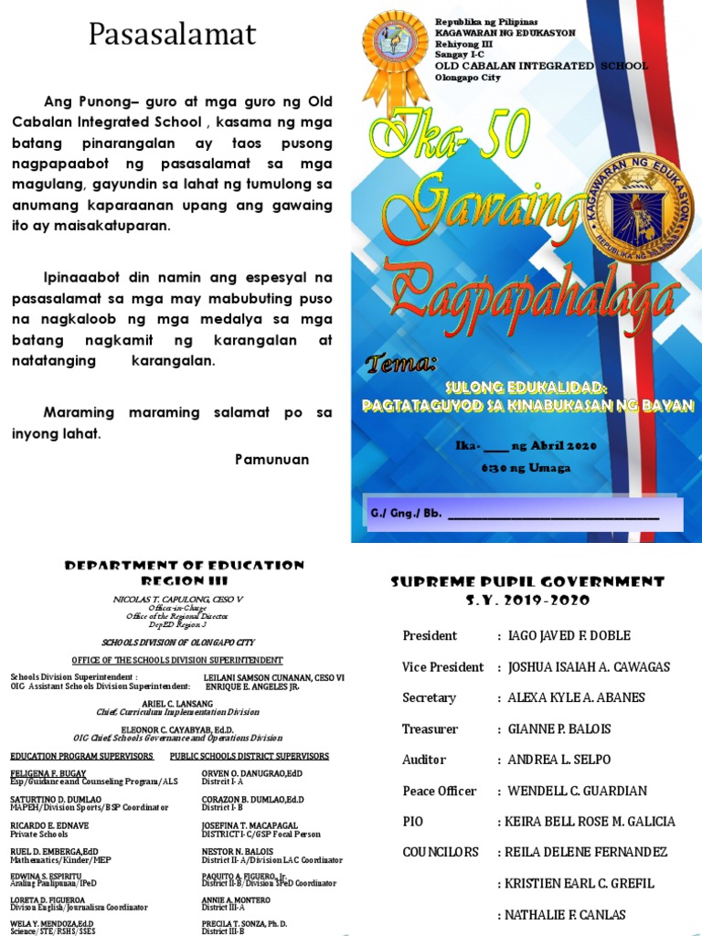 Sa ating mahal na Punong-Guro mga butihing guro at tagapayo at sa aking mga kapwa mag-aaral isang maalab na pagbati po ng magandang umaga sa inyong lahat. Kung didinggin natin ang Kanyang mga salita at ipamumuhay ang mga utos maliligtasan natin ang panahong ito ng kapabayaan at kasamaan. Dooy nakipagkita kami sa ilan pa nating mga miyembro.