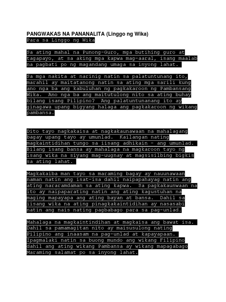 Final speech in nutrition. 2015-08-01 PANGWAKAS NA PANANALITA Linggo ng Wika Ang sumusunod na artikulo ay mula sa isang maikling talumpati ng isang mag-aaral sa elementarya para sa Linggo ng Wika. Pangwakas na pananalita sa pagdiriwang ng pwu araw ng wika at kultura showing 1-1 of 1 messages.