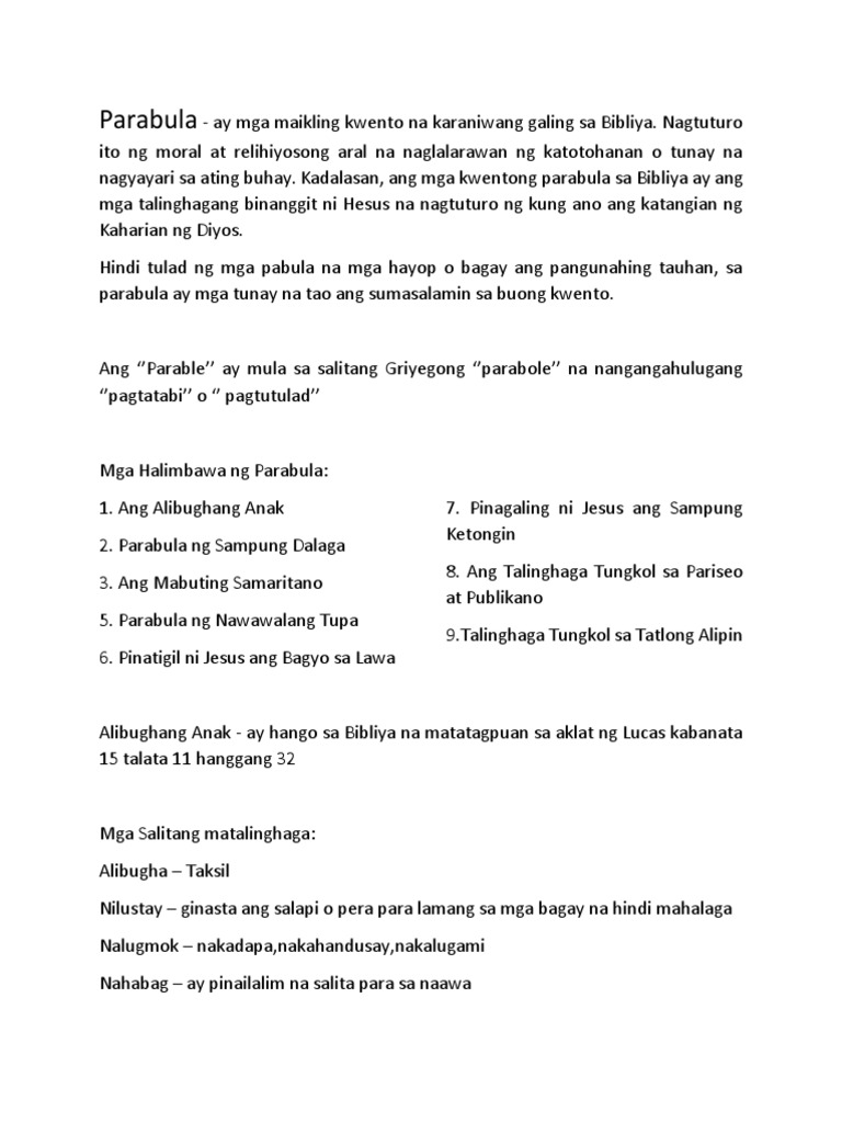 Ang mga parabula ay nagbibigay ng payo o aral tungkol sa moralidad o sa relihiyon. Nang bandang huli ay tumakas siya sa mainggiting si Haring Saul. Wawalong tao ang nakaligtas sa Baha pero sa katagalan ay dumami rin sila.