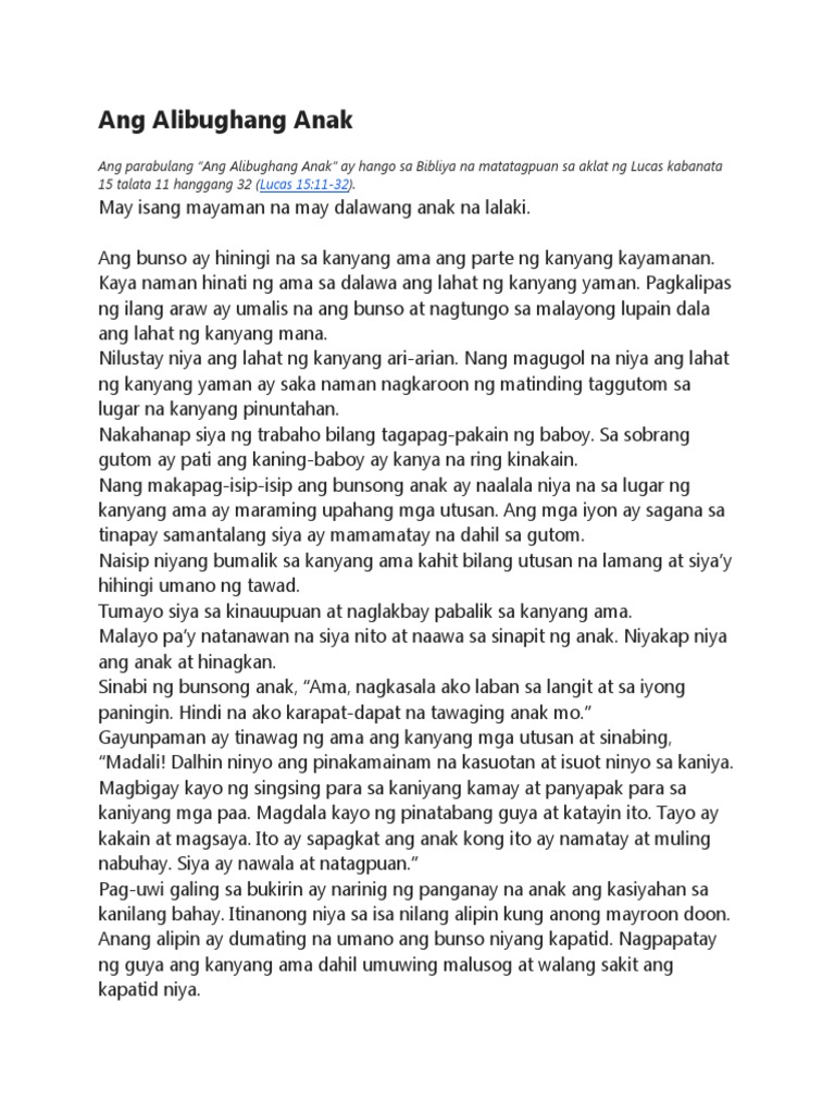 Ang Alibughang Anak Ang parabulang Ang Alibughang Anak ay hango sa Bibliya na matatagpuan sa aklat ng Lucas kabanata 15 talata 11 hanggang 32 Lucas 1511-32. Mula sa Baha Hanggang sa Paglaya sa Ehipto. Ang anomang bagay ay magagawa ng Diyos kapag marunong tayong magtiwala sa kanya.