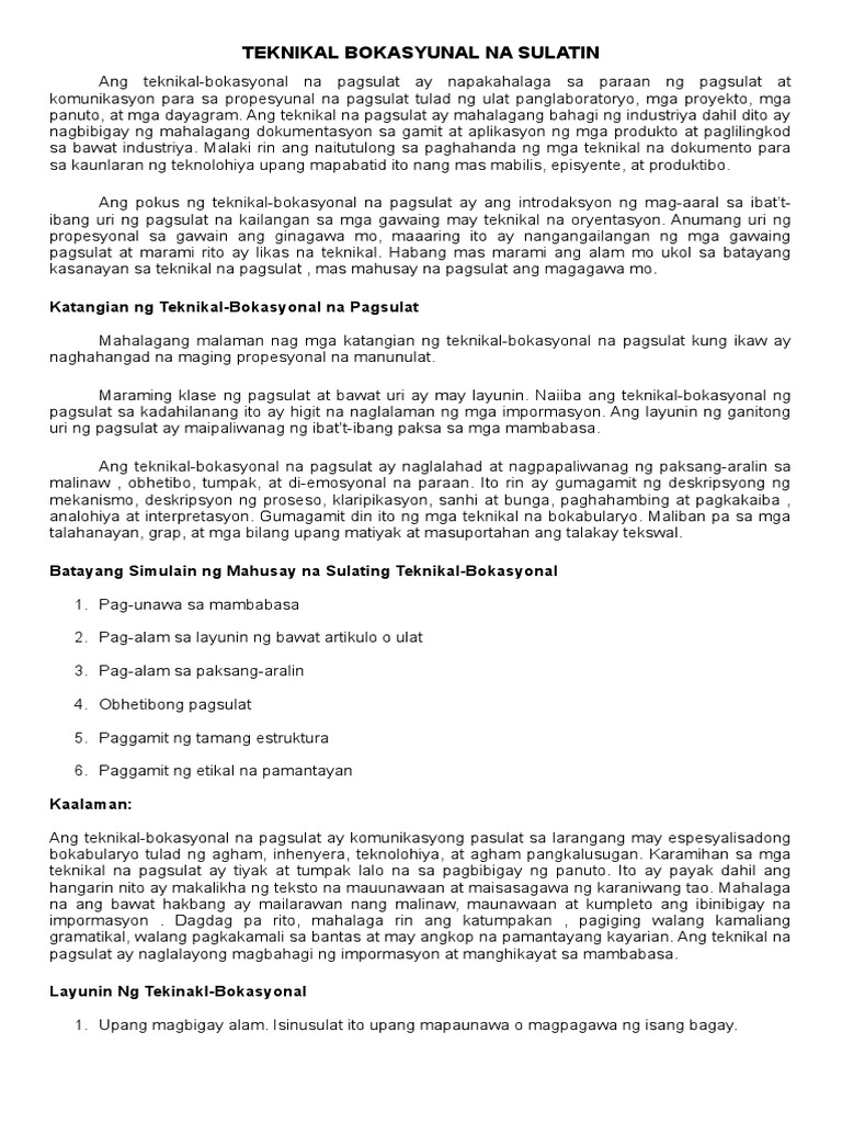 Teknikal Bokasyunal Na Pagsulat Teknikal Bokasyunal Na Pagsulat Kahulugan Ito Ay Komunikasyong Pasulat Sa Larangang May Espesyalisadong Course Hero