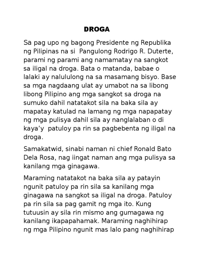 2020-11-06 TALUMPATI TUNGKOL SA DROGA Sa paksang ito magbibigay kami ng ibat-ibang halimbawa ng mga talumpati patungkol sa droga at ang mga epekto nito. Lulong at bangag ang karamihan sa mga salarin. Ang paglaganap ng illegal na droga sa Pilipinas ay isa sa pinakamabigat na problema sa ating komunidad.